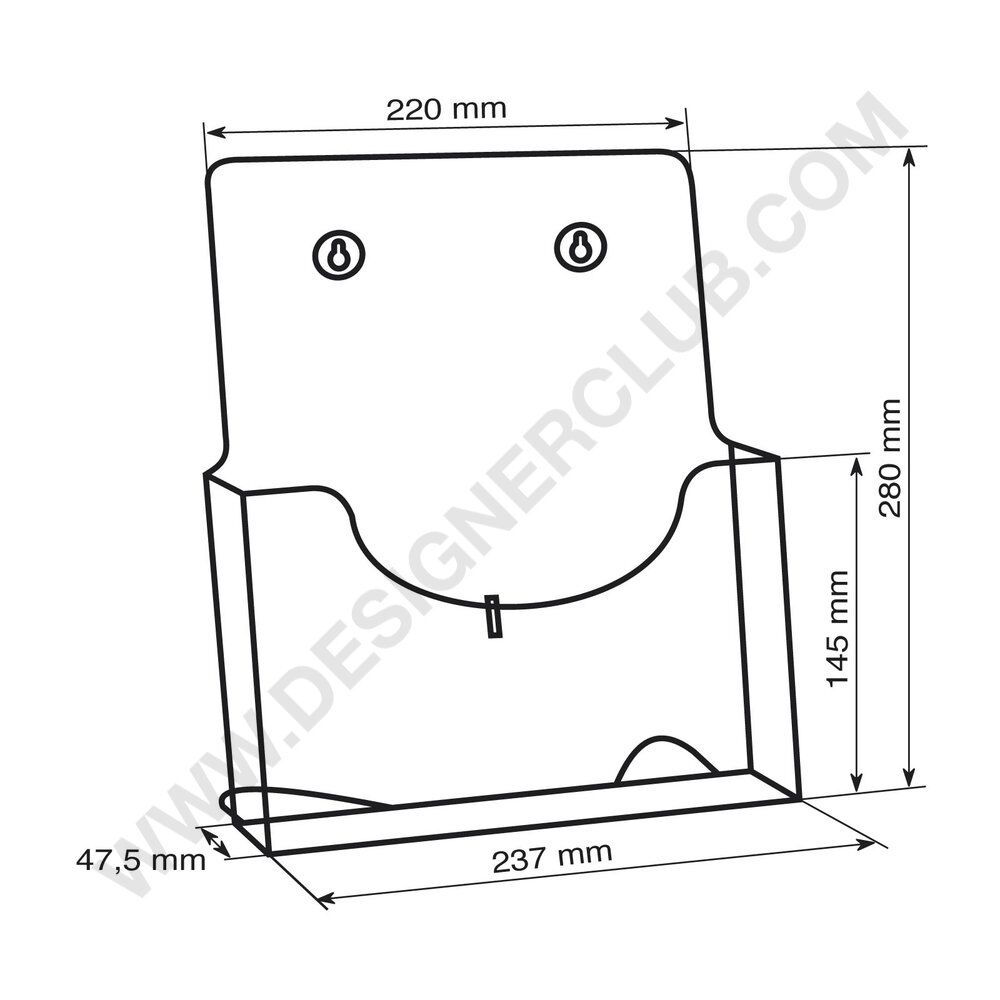 Liets polistirola informācijas turētājs, kurš paredzēts izvietošanai uz sienas vai horizontālās virsmas. Piemērots bukletu glabāšanai.