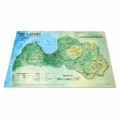 Trīsdimensiju fizioģeogrāfiskā Latvijas karte. Izmērs: A4, 297 x 210 mm. Mērogs: 1:1626000. Uz kartes ir attēlotas reljefa formu nosaukumu klāsts, ortogrāfiskais griezums, pilsētas, ceļi un dziļumu/augstumu skala. Iepakota caurspīdīgā maisiņā.