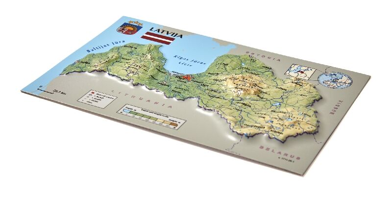 Trīsdimensiju fizioģeogrāfiskā Latvijas pastkarte. Izmērs: 170 x 120 mm Mērogs: 1 : 2 840 000. Uz kartes ir attēlotas pilsētas un dziļumu/augstumu skala. Aizmugures pusē ir pastkartes dizains. Var sūtīt pa pastu. Iepakota caurspīdīgā maisiņā.