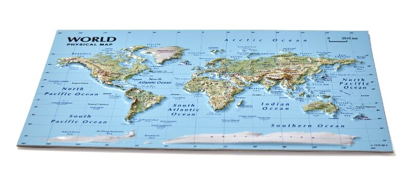 Trīsdimensiju fizioģeogrāfiskā Pasaules pastkarte. Izmērs: 170 x 120 mm Mērogs: 1 : 251 500 000 Uz kartes ir attēlotas pilsētas un dziļumu/augstumu skala. Aizmugures pusē ir pastkartes dizains. Var sūtīt pa pastu. Iepakota caurspīdīgā maisiņā.